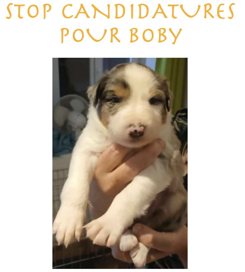 La maman et le papa de Boby ont été confié à l association borderlinecollie par un élevage non professionnel en cours de fermeture. La maman a mis bas de sept petits. Ils seront prêts à partir à la mi mars. La maman aux yeux vairons et le papa sont de type compagnie très gentils et pot de colle.Foyer recherché